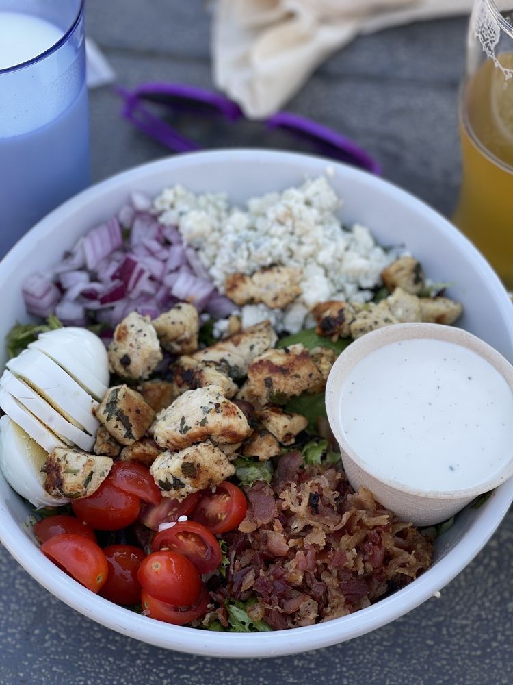 chopped chicken, hard-boiled egg, diced bacon, avocado, tomato, red onion, crumbled bleu cheese, spring mix